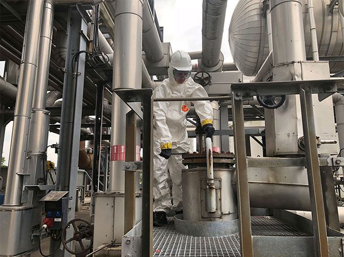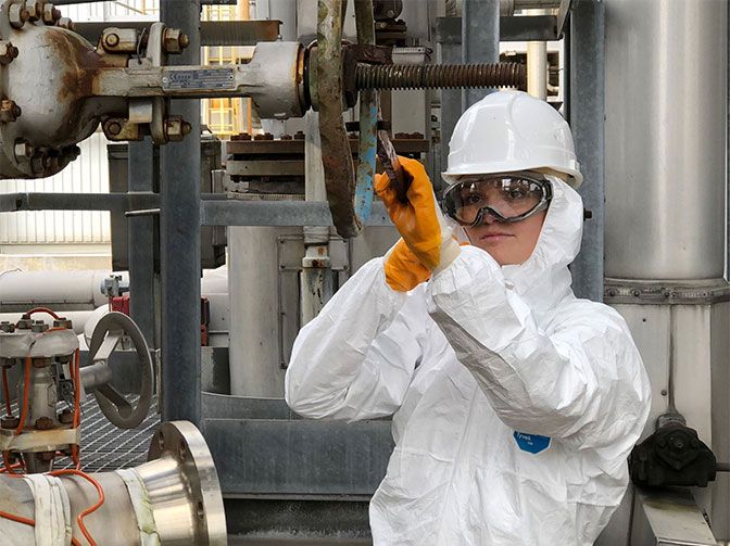To provide protection from liquid chemicals, Dow makes use of Tychem® 2000 C (previously: Tychem® C) and Tychem® 6000 F (previously: Tychem® F) coveralls. Typical applications are material transfers or inspection tasks in which lines are opened and there is a risk of personnel being contaminated with the hazardous substance. These garments are also used during the emptying and cleaning of pipework which is required for regular official TÜV1 inspections.