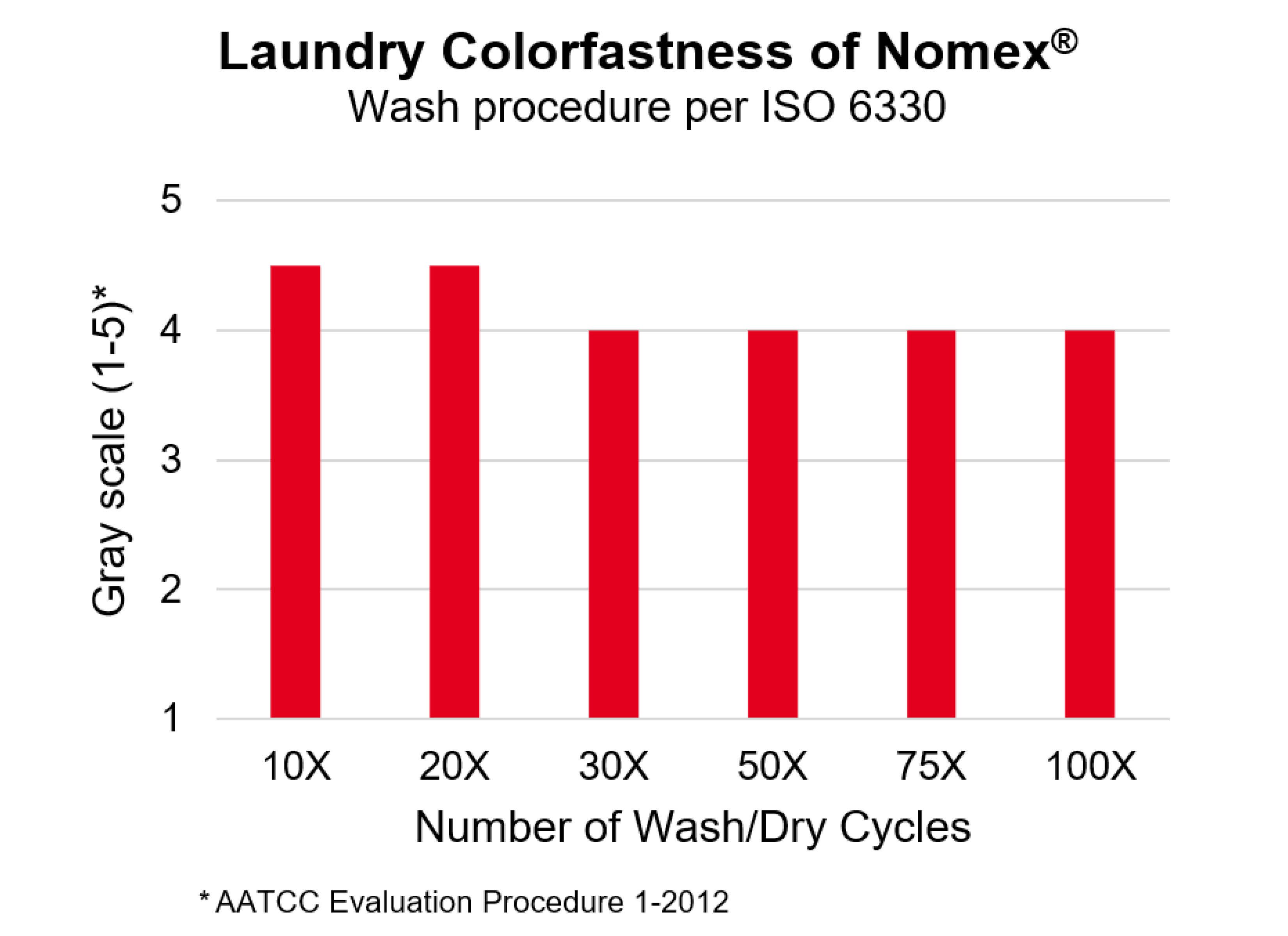 In addition, garments made of Nomex® have a better color-fastness and appearance retention versus FRT cotton/nylon, with superior professional appearance throughout the lifecycle of the garment. And they rarely need pressing; they come out of the dryer ready to wear, in contrast to FRT cotton garments, which wrinkle significantly after washing and drying.