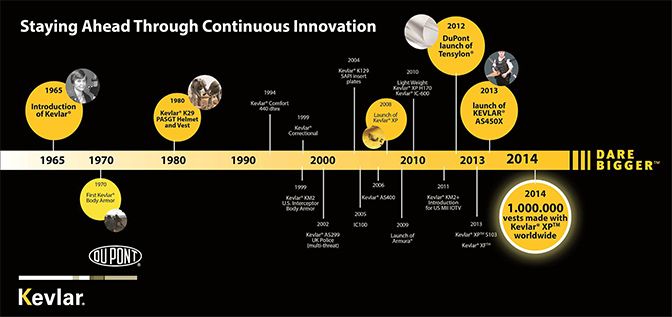 DuPont is continuously innovating to address the evolving protective requirements of the military, police and security markets the world over. DuPont recently launched DuPont™ Kevlar® AS450X, specifically engineered for greater comfort to the body armour wearer while protecting against multiple threats including bullets, knives, spikes, bullets and blunt objects; and DuPont™ Kevlar® XP™ S104, a water repellent fabric that offers enhanced bullet stopping power and reduced back face deformation, even in hot and humid climates and wet conditions.
