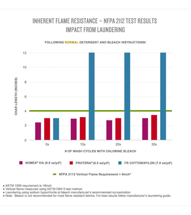 What By the time you've laundered only ten times with chlorine bleach, the FR effectiveness of FR-treated cotton is, in essence, eliminated. Both fabrics made of Nomex® and Protera® maintain their flame resistance well into 30 launderings even in the presence of chlorine bleach.